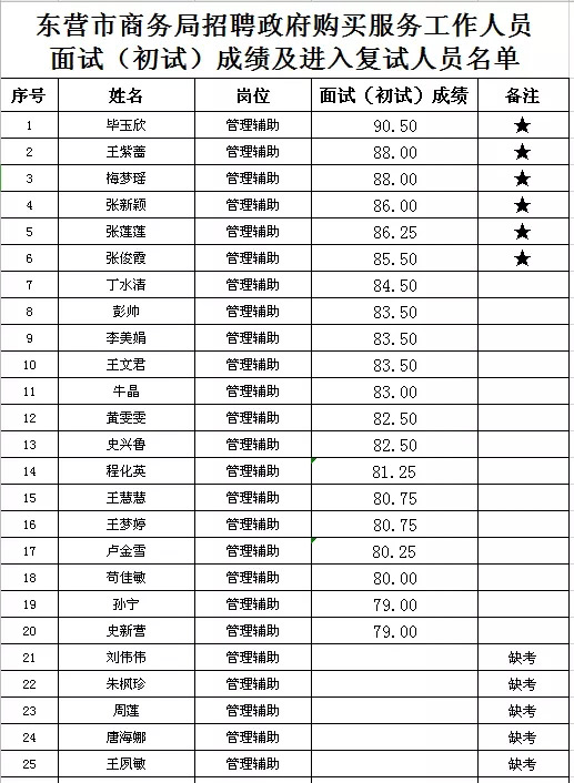關(guān)于公布東營市商務局招聘政府購買服務工作人員面試(初試)成績及進入復試人員名單的通知